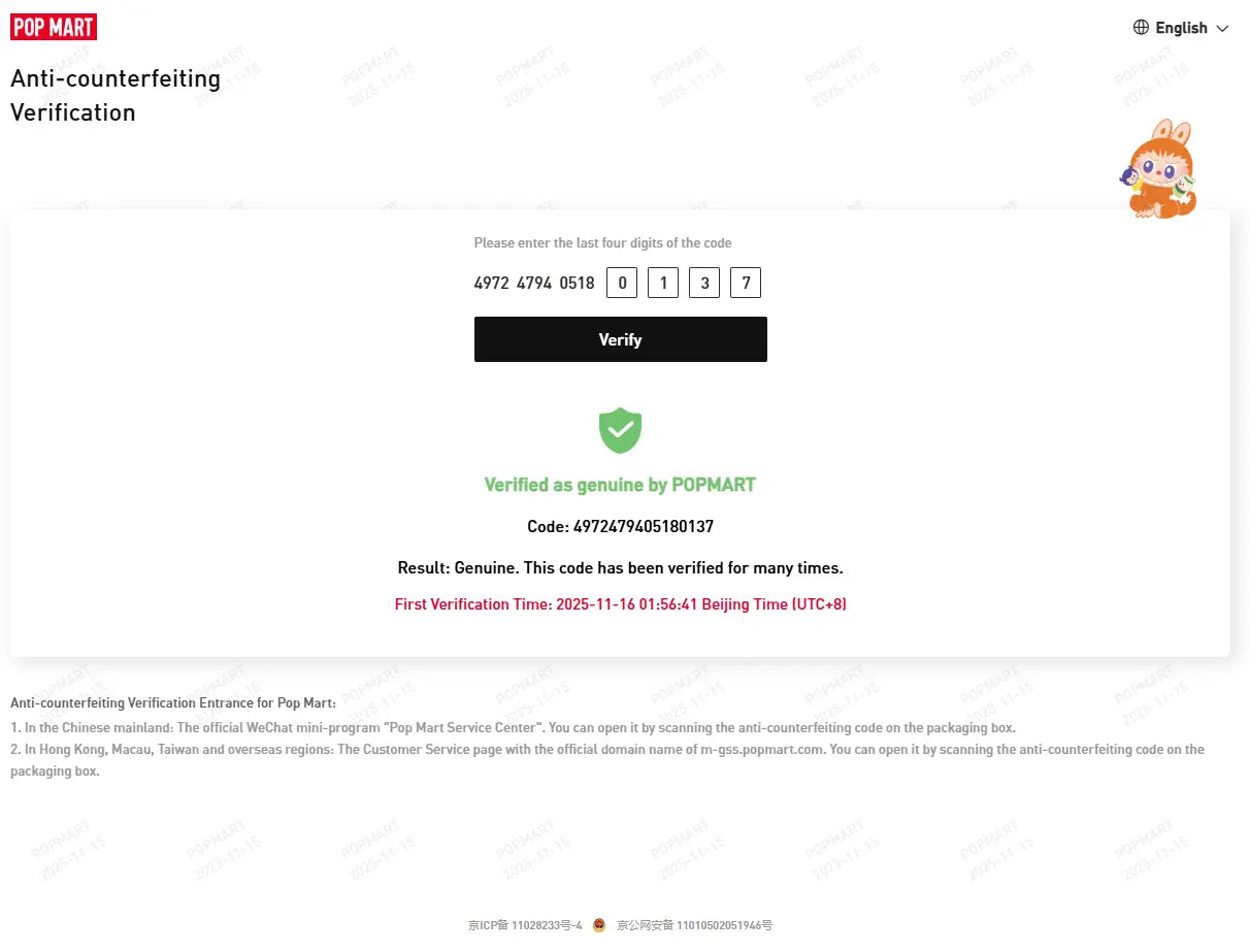For verification, the last photos show one of the Labubus authenticated through the QR code on the back. You can match it yourself, as the code is visible, though each Labubu will have its own unique verification.