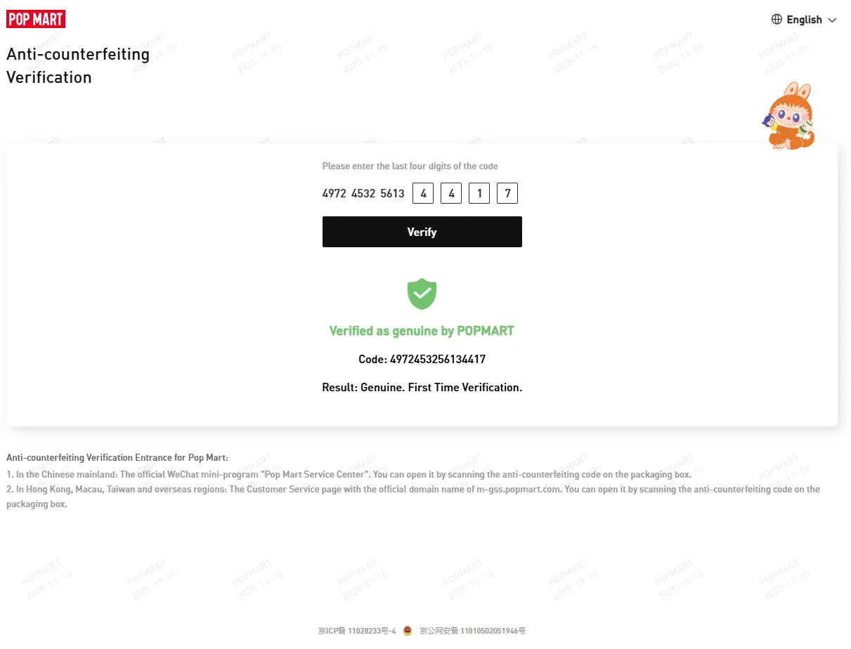 For verification, the last photos show one of the Labubus authenticated through the QR code on the back. You can match it yourself, as the code is visible, though each Labubu will have its own unique verification.